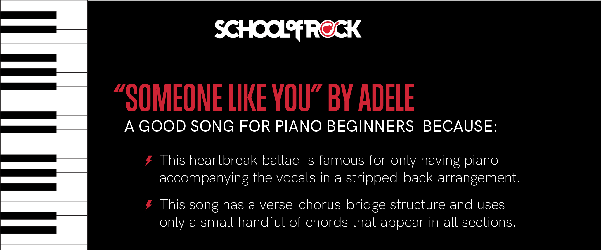 No matter what style and era of music you like, there are lots of songs out there to begin learning to help develop skills on a keyboard and have fun playing. All the songs above feature piano or keyboard instruments in some way, and have transcriptions or arrangements in the School of Rock Method App. There are also lots of songs that are great to learn for beginners even if there isn’t a distinct piano part. Just start with learning some simple chord shapes and go from there. Learning just the melody for pop songs can also be a great starting place for getting familiar with the instrument.