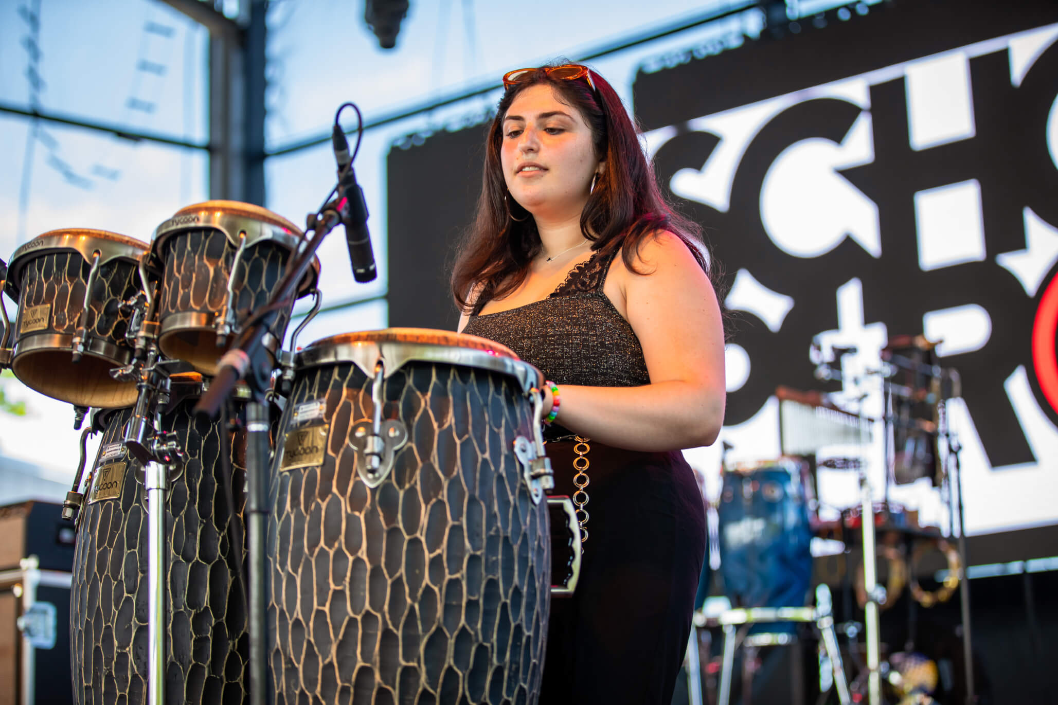 The Conga is a Cuban instrument. It is a deep drum, made with barrel stave construction, and a single animal-skin head. They are tall enough to be played with the base of the drum resting on the ground while the player sits. Originally bands would have three different conga players. Each playing a different sized drum. Much like the modern drum kit, over time this has merged into a single player covering multiple parts or drums.