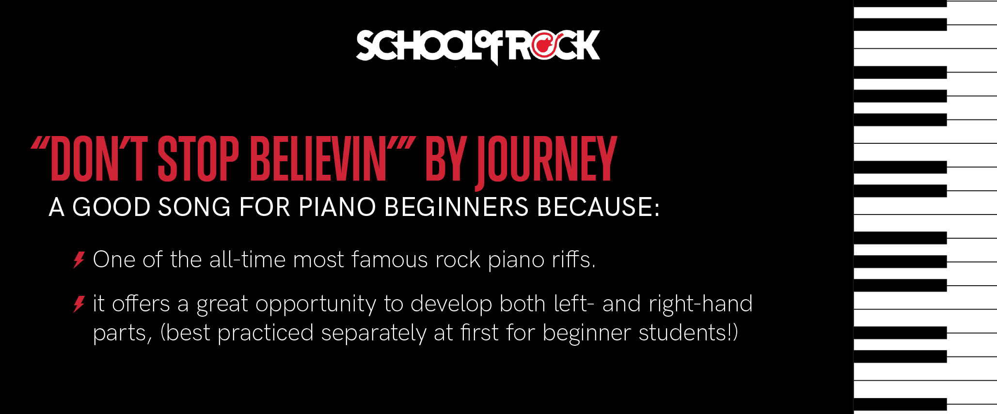 No matter what style and era of music you like, there are lots of songs out there to begin learning to help develop skills on a keyboard and have fun playing. All the songs above feature piano or keyboard instruments in some way, and have transcriptions or arrangements in the School of Rock Method App. There are also lots of songs that are great to learn for beginners even if there isn’t a distinct piano part. Just start with learning some simple chord shapes and go from there. Learning just the melody for pop songs can also be a great starting place for getting familiar with the instrument.